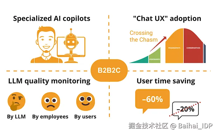 - 利用现有客户群的竞争策略。在理想状态下,每个 B2B 模式的客户都已拥有自己稳定的客户群体。此时,融入 LLMs 技术的 B2B2C 产品便能够帮助这些 B2B 模式的客户,或是增加从其客户身上获得的收益,或是减少服务交付过程中的成本开销。