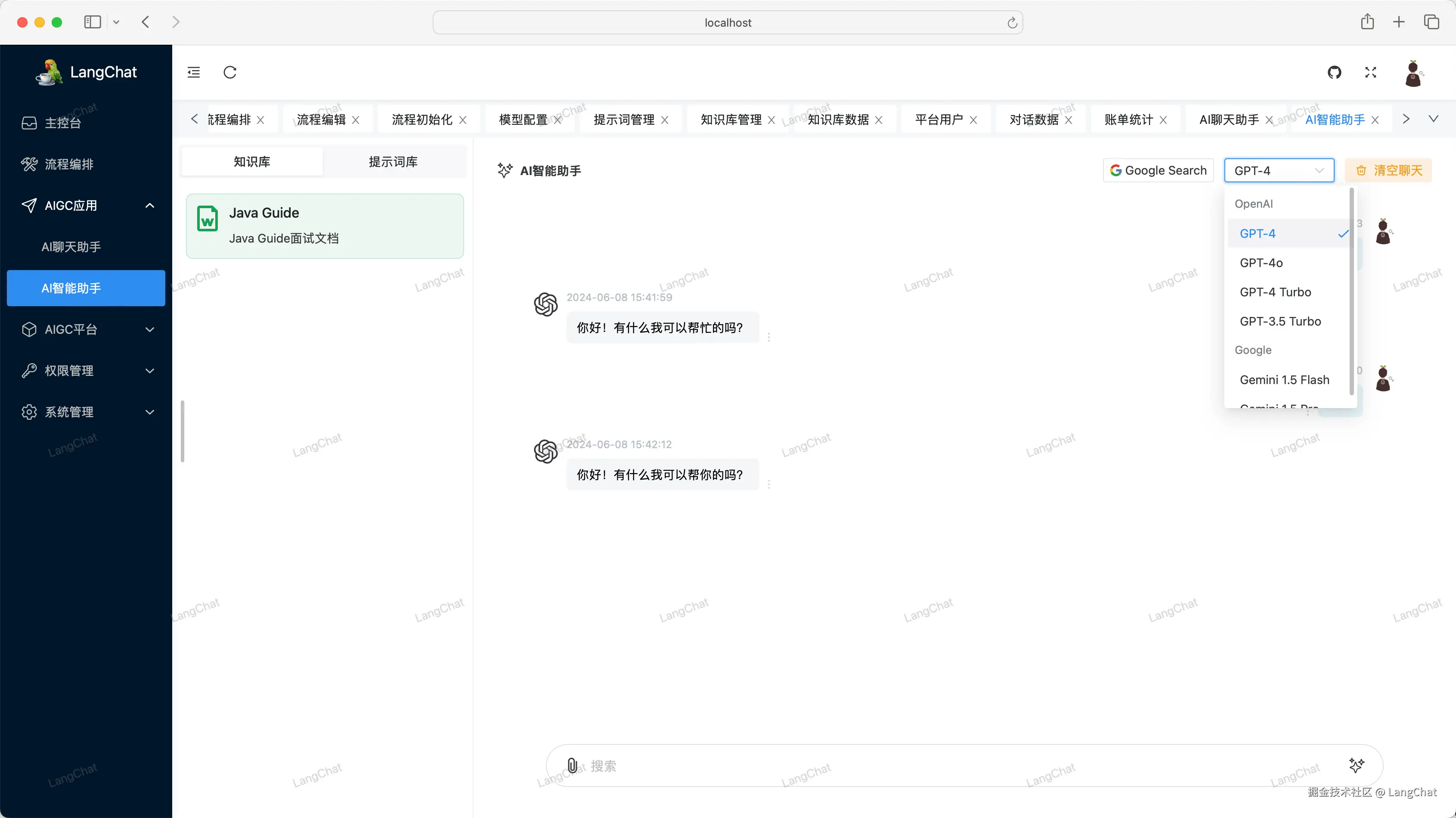 LangChat是Java生态下企业级AIGC项目解决方案,在RBAC权限体系的基础上,集成AIGC大模型功能,帮助企业快速定制知识库、企业机器人。