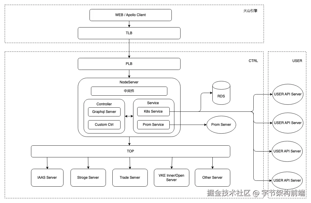在介绍细节方案前,可以看下整体设计,有个基础认知。前端在里面主要通过 GraphQL 能力聚合各种微服务及自身提供的 Service,同时提供了一系列鉴权、request库、日志、metrics、限流等通用中间件,而 Service 在模块设计里则是主要负责复杂且领域相关的业务逻辑对接中,其中会直接对接用户集群及 RDS 等,Service 本身的设计充分遵循的 DDD 的领域设计,能够快速移植到 Anywhere,不跟其他模块有所耦合。