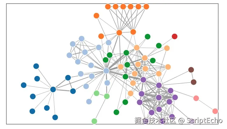 此代码使用 D3.js 创建边和节点元素。边是线条,节点是圆圈。节点的颜色根据其组进行设置。