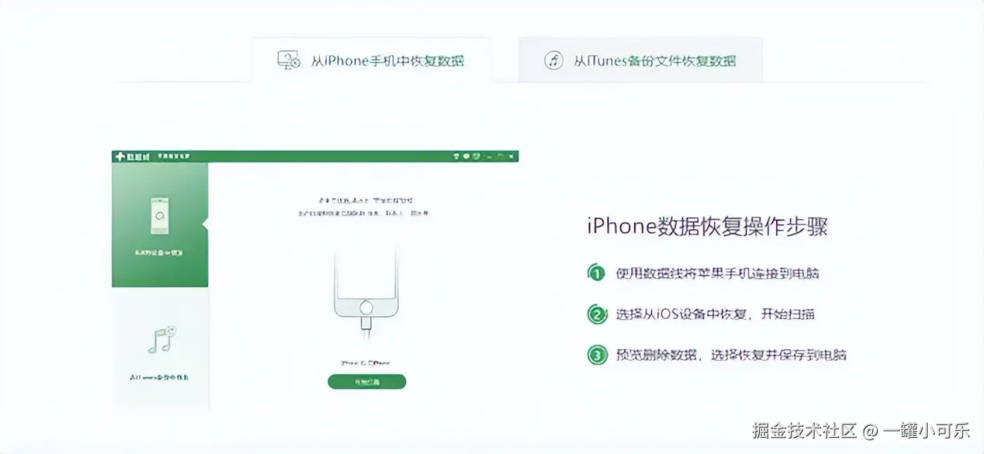 步骤2:完成安装后,需要使用数据线连接手机和电脑进行扫描步骤。有两个扫描方式可供选择,一是从手机中恢复数据,可以预览删除数据;二是从iTunes备份中恢复数据,可以预览扫描结果,进行选择性数据恢复。