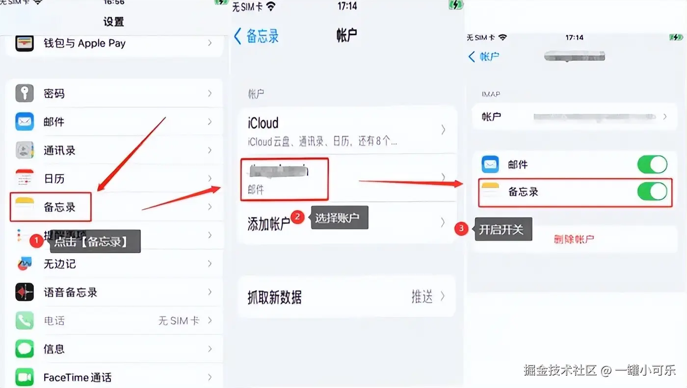 方法一:通过【电子邮件账户设置】找回备忘录