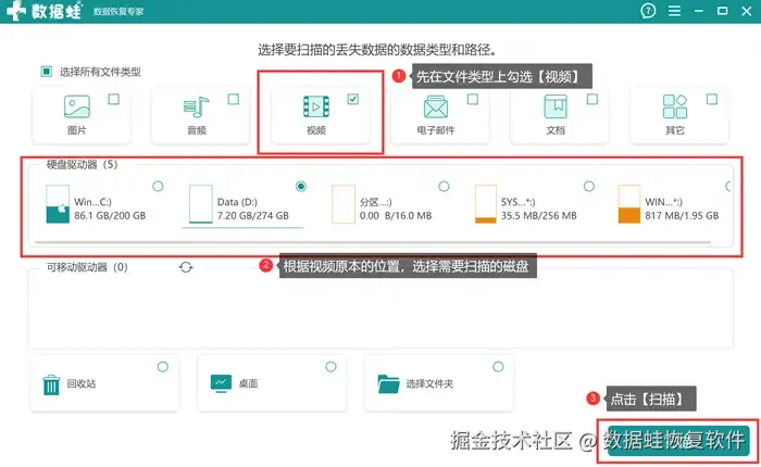 第二步: 打开软件,先在文件类型上勾选【视频】 ,然后再选择要进行扫描的磁盘,最后再点击右下角的扫描,然后软件便开启扫描工作了。