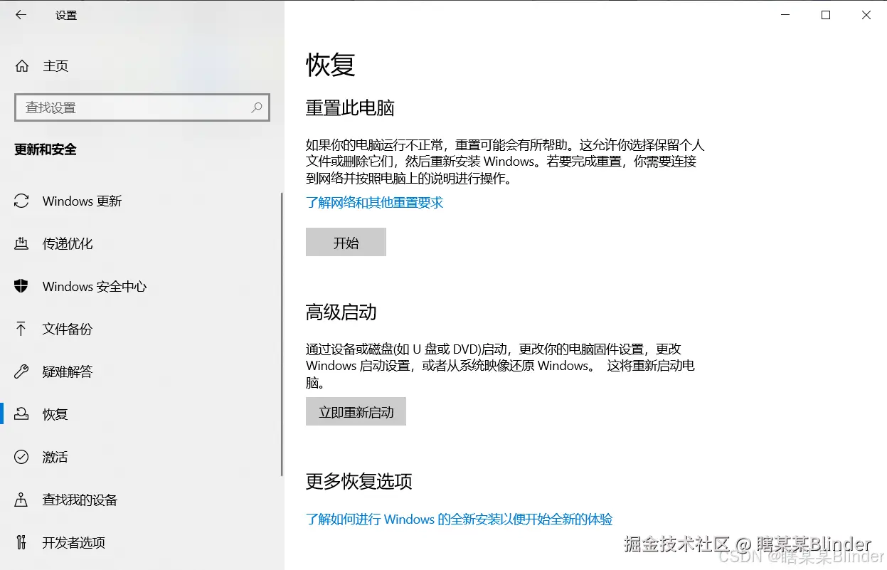 在windows的设置中找到“恢复”界面,找不到可以去设置的搜索里搜