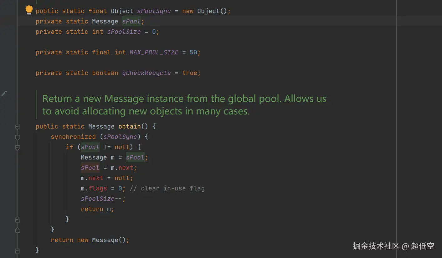 通过Handler#handleMessage接收的消息,在消息执行完成之后。如果后续有新的消息需要被使用,那么系统会通过Message#obtain创建消息时,就会从Message#sPool 中进行复用。