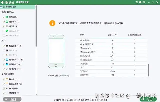 步骤2:使用苹果数据线连接电脑软件和苹果手机,等待软件扫描手机数据信息,进行备份。扫描成功后,软件主页左侧导航栏显示详细的手机数据,右侧则显示数据概览,用户可根据自身需求选择适合的预览界面。