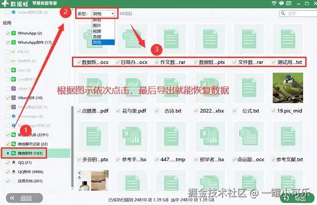步骤3:用户在左侧导航栏中下拉找到 【微信附件】 ,点击选中就可以在右侧预览界面中显示已扫描的附件数据。由于附件的类型较多,在预览界面上方可以选择 【其他】 类型,就会显示微信聊天中的文件。最后,根据自己的需求,勾选需要恢复的文件,点击 【导出】 即可。