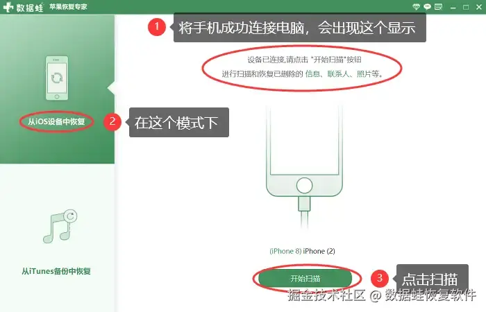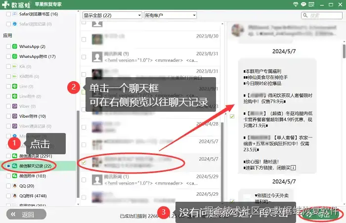 微信聊天记录恢复软件可靠吗?我们可以尝试专业软件(数据蛙苹果恢复专家)来进行扫描。这款软件恢复手机数据的优点主要包括以下5个方面: