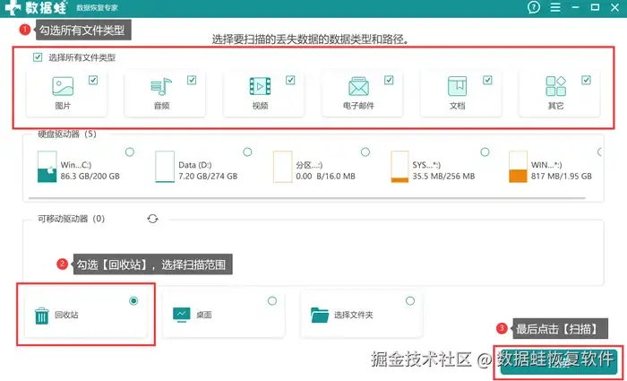 如果以上两个技巧都没能成功,那不妨试一下使用专业的第三方数据恢复软件来恢复丢失的回收站文件吧!在这里我强烈推荐一款功能强大,操作便捷的数据恢复软件【数据 蛙恢复专家】。