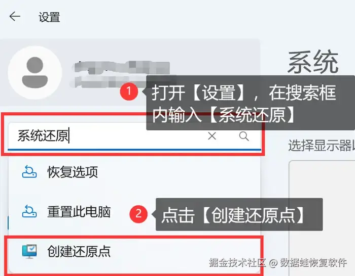 步骤1:打开电脑的 【设置】 ,然后在设置的搜索框内输入【系统还原】。点击下方出现的 【创建还原点】 。