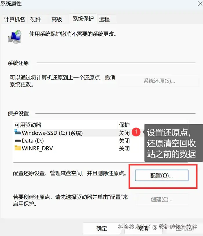 步骤2:点击【配置】 ,设置还原点,将电脑数据还原到清空回收站之前的状态。