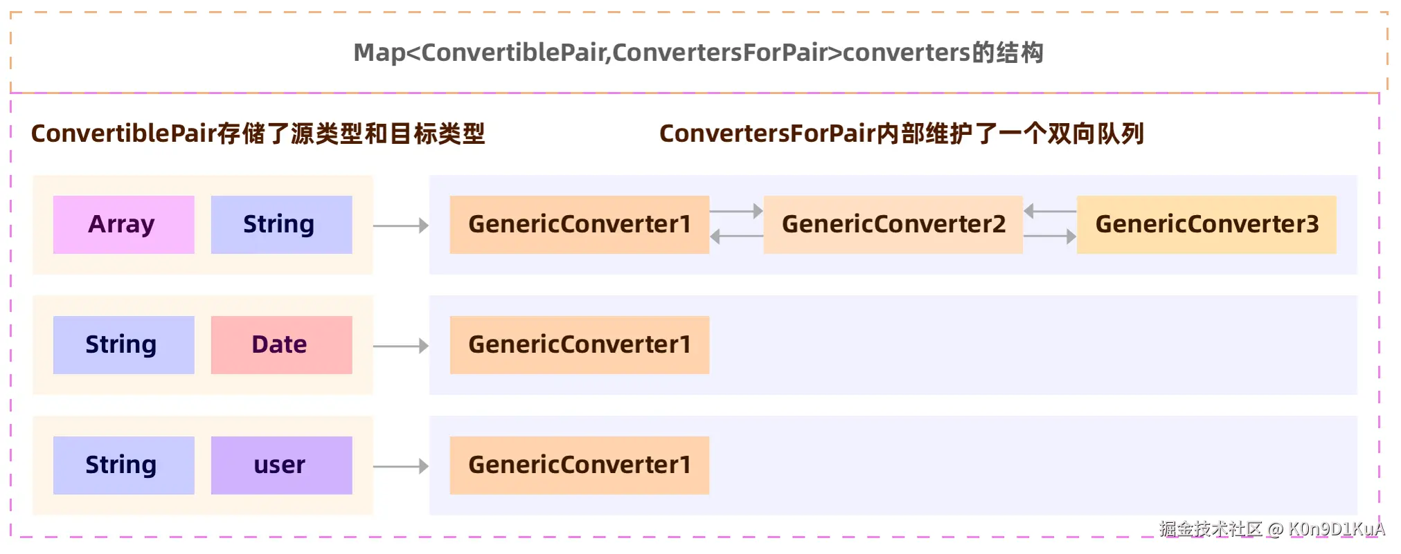 // ConvertersForPair:这一对对应的转换器们(因为能处理一对类型转换可能存在多个转换器),内部使用一个双端队列Deque来存储,保证顺序