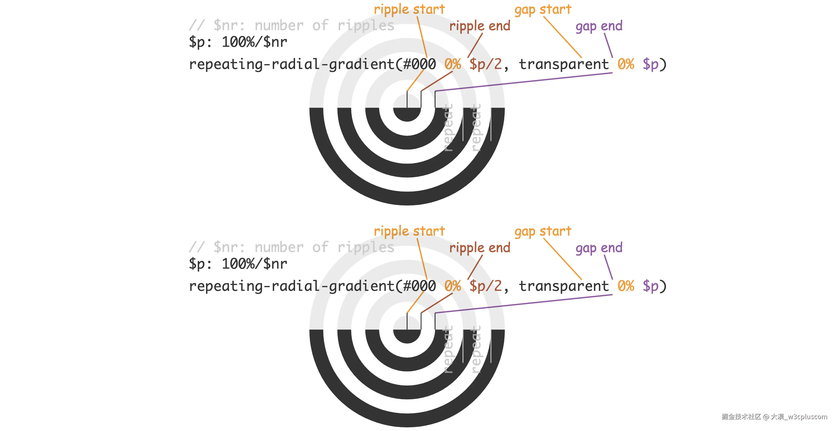 除此之外,我们还可以使用repeating-radial-gradient()绘制循环的圆: