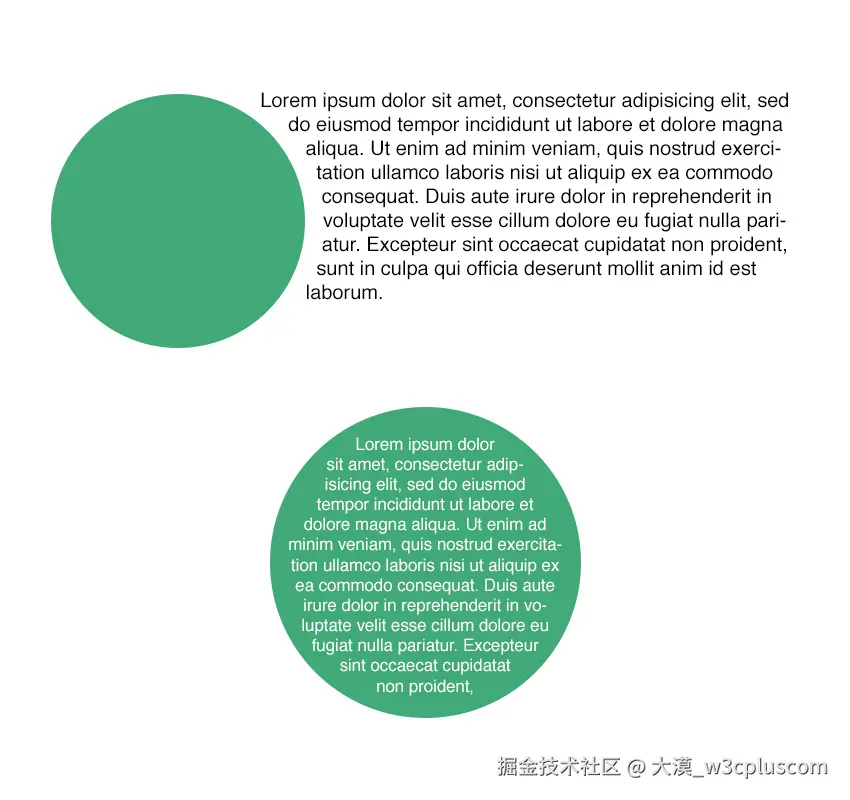 前面提到过,circle()函数除了可运用于clip-path属性中之外,还可以运用于shape-outside和shape-inside属性中实现一些不规则的布局效果。比如说文本围绕圆形边缘布局或文本在圆形内布局。其中shape-outside在一些主流浏览器中能看到效果,但是shape-inside支持的浏览器有限。如果我们要实现文本在一个圆内排列这样的效果,可以借助shape-outside来模拟。比如下面这个示例: