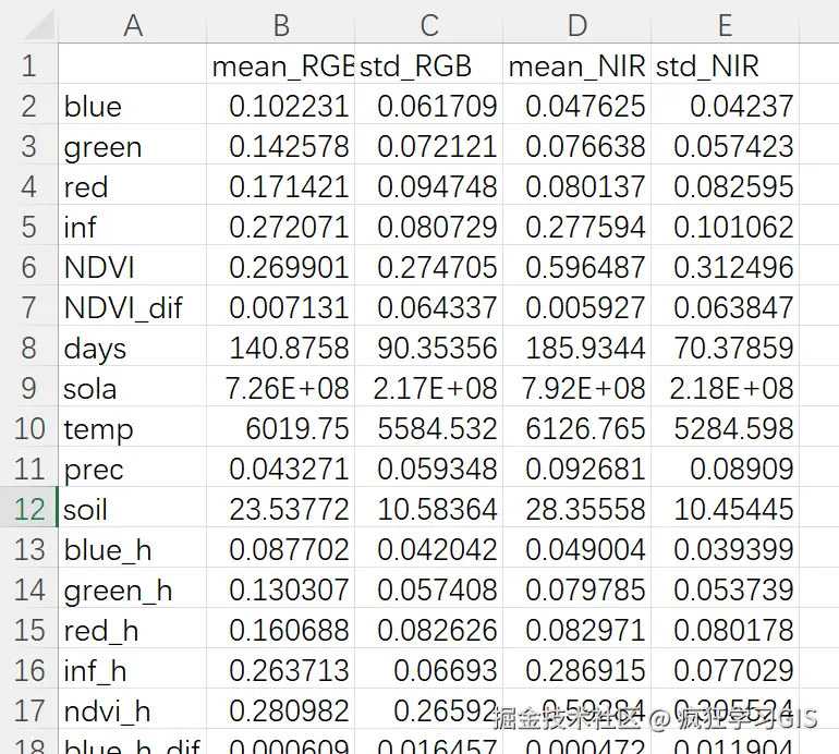 然后,使用pd.DataFrame创建了一个新的数据框data_new,其中包含了4列数据:mean_RGB列存储了data中计算得到的平均值,std_RGB列存储了data中计算得到的的标准差;mean_NIR列存储了data_nir中计算得到的平均值,std_NIR列存储了data_nir中计算得到的标准差。