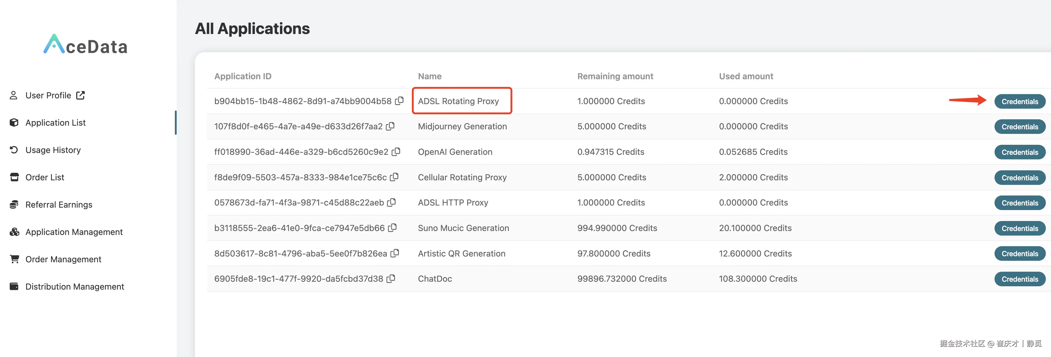 点击 「Credentials」,即可查看使用 ADSL 代理服务的用户名及密码,以冒号分隔,其中用户名是 8 位,密码是 32 位,如图所示: