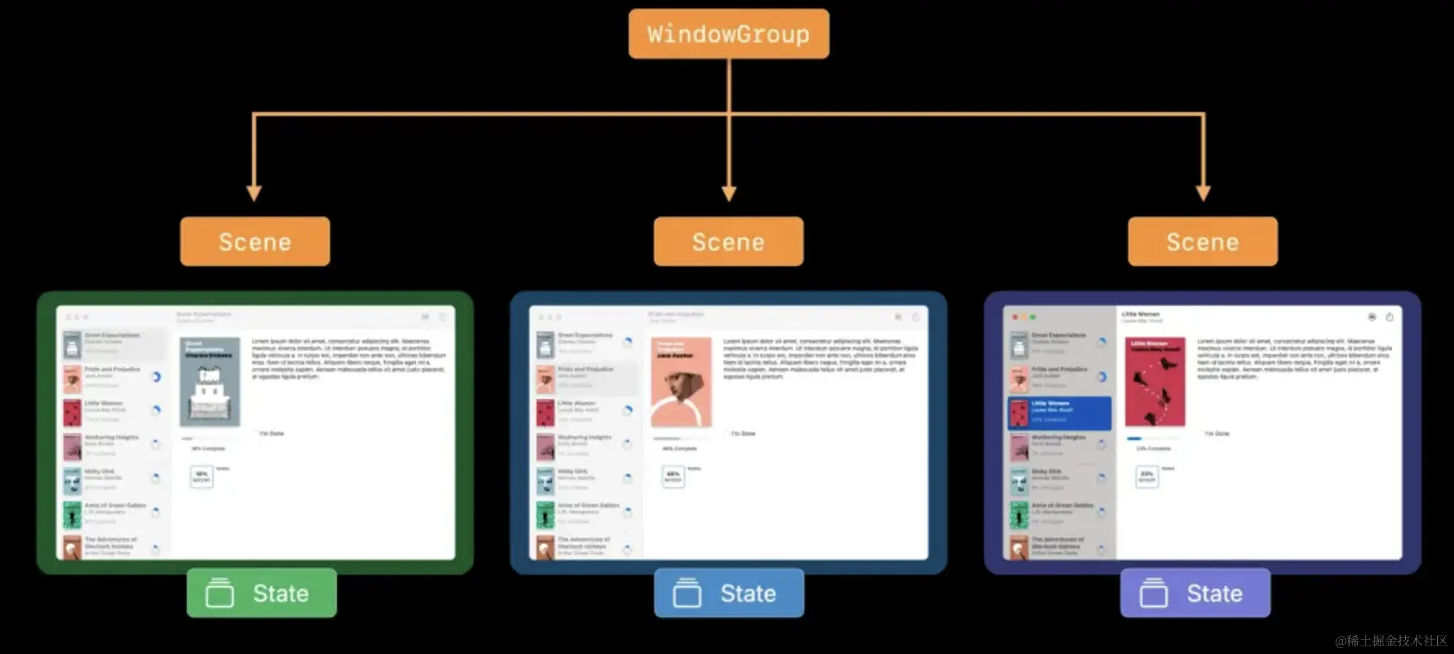 如果在一个WindowGroup加入多个View,呈现状态有点类似VStack。在一个Scene中加入多个WindowGroup,只有最前面的可以被显示。以 macOS 为例 WindowGroup 可以实例化多个 Scene,这些不同的 Scene 可以单独的响应用户的事件,虽然每个 Scene 都来自同一份 UI 定义,但是不同时刻的用户行为也会导致不同的 Scene 含有不同的状态。