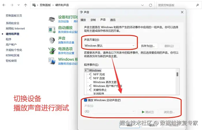 步骤2:进入控制面板,选择 【声音】 ,进行声音播放测试。如果更换电脑音频输出设备后恢复正常,那么很可能是原播放设备出现了故障,需要进行更换。