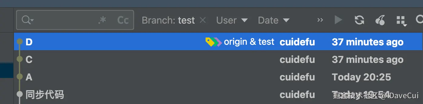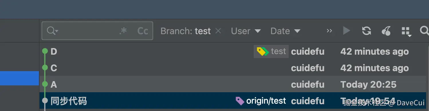 git push --force操作后远程和本地都没A、C、D的记录了。