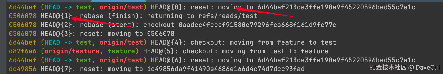 git reflog 的输出会列出最近的所有 HEAD 变更操作,每一行都会显示一个操作记录和对应的 commit hash。