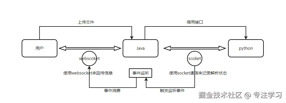 由于业务原因需要实时的获取文件的解析状态,因此选用实时通信的协议,和前端通信选用的是webSocket、和python端通信使用的是socket;同时在两种协议交互的中间采用事件监听的方式实现,这里有多种方式实现。下面是具体的业务逻辑图。