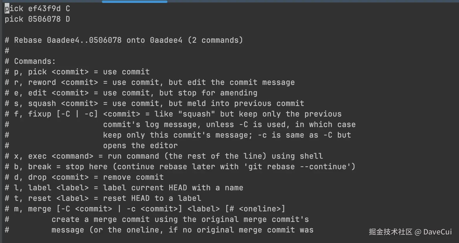 这将打开一个文本编辑器,列出从 abcdefg 到最近的所有 commit。找到你要删除的 commit,将其前面的 pick 改为 drop,或者直接删除那一行。