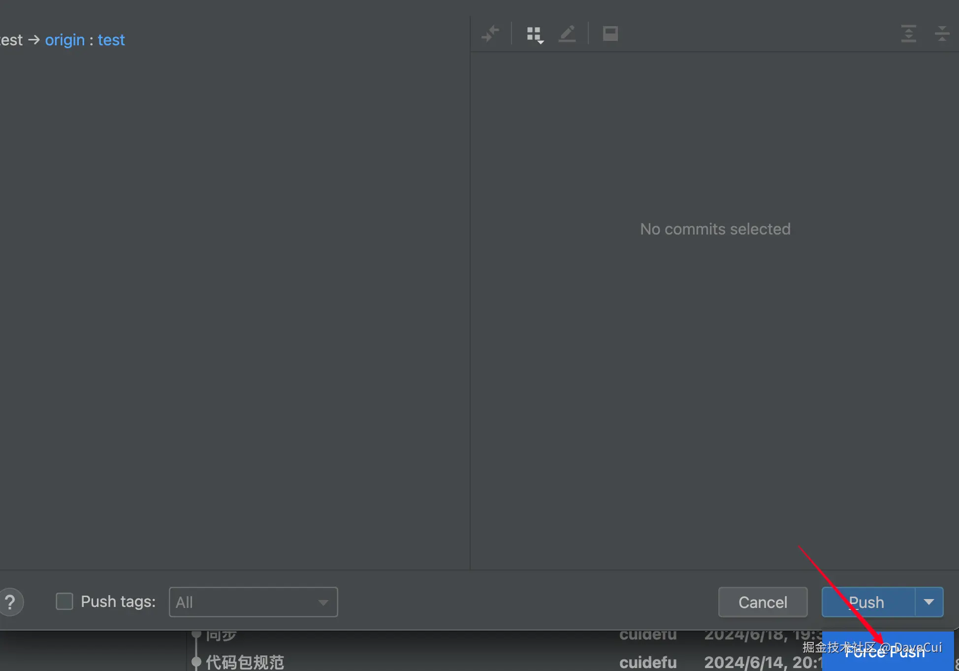 这个时候还没结束,我们的操作修改git历史,如果这些commits已经被推送到了远程仓库,需要进行git push --force来强制推送。