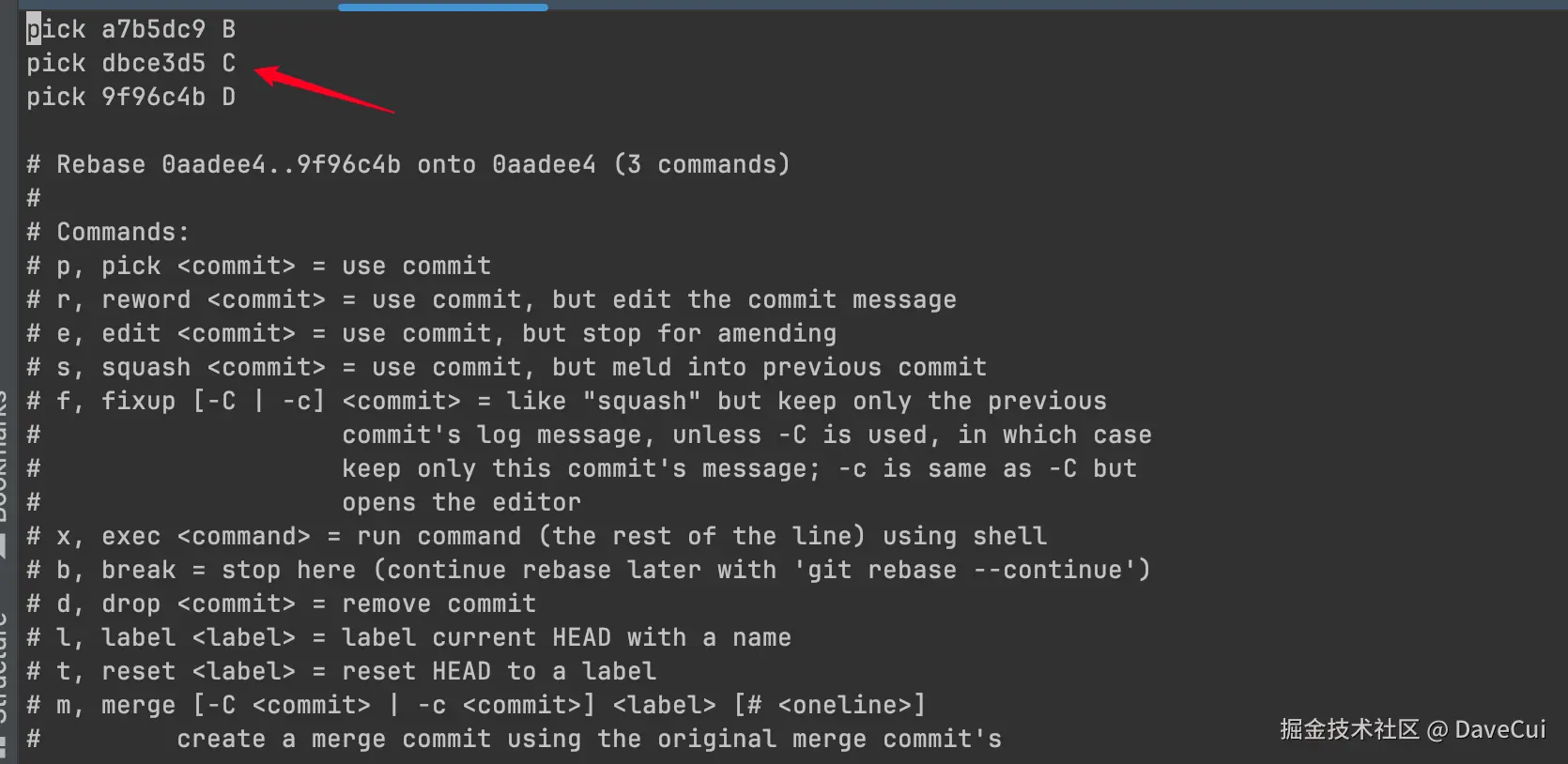 3. 将要删除的commit的行(B) 前面的pick改为drop或者直接删除那行。