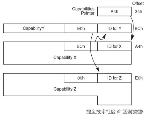 Capabilities其实就是一个单向链表. 0x34寄存器中的值是第一个capability在配置空间中的偏移, 如下图, 先0xA4处是第一个capability, 0x5C是第二个capability. 以此类推, 直至找到0x10(PCIE能力标识)或一个都没找到后结束.