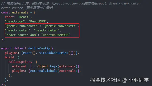 比如react-router-dom需要依赖react、@remix-run/router、react-router,因此需要放在最后。