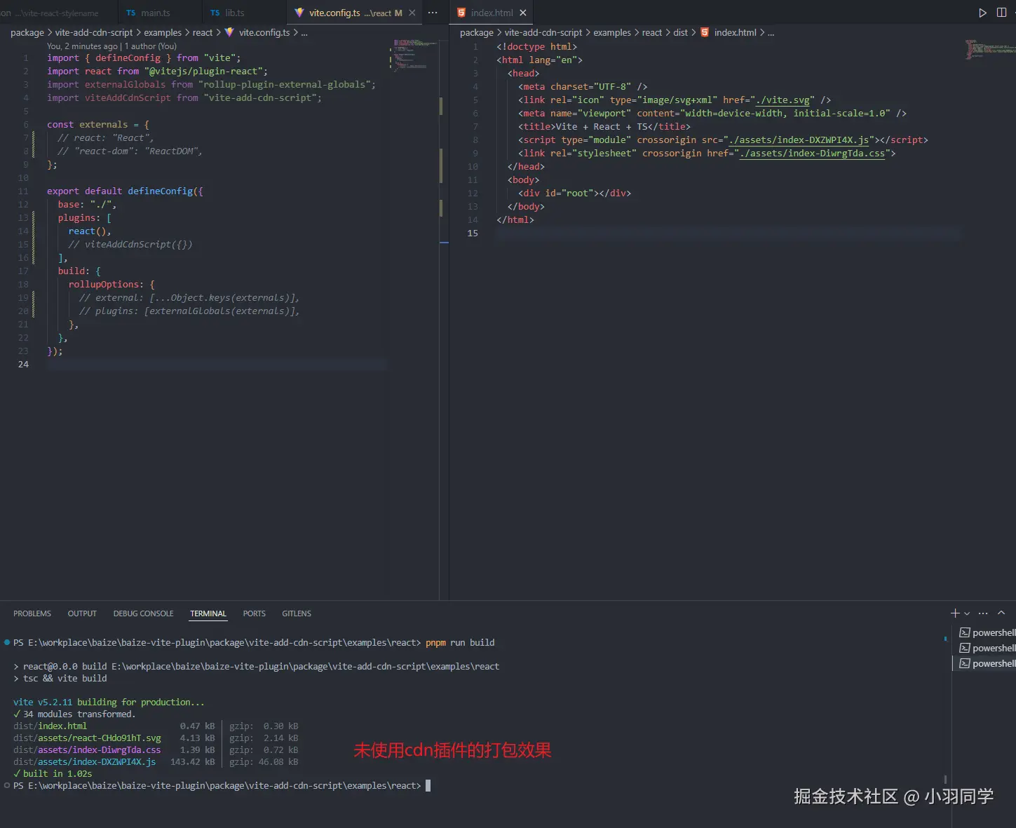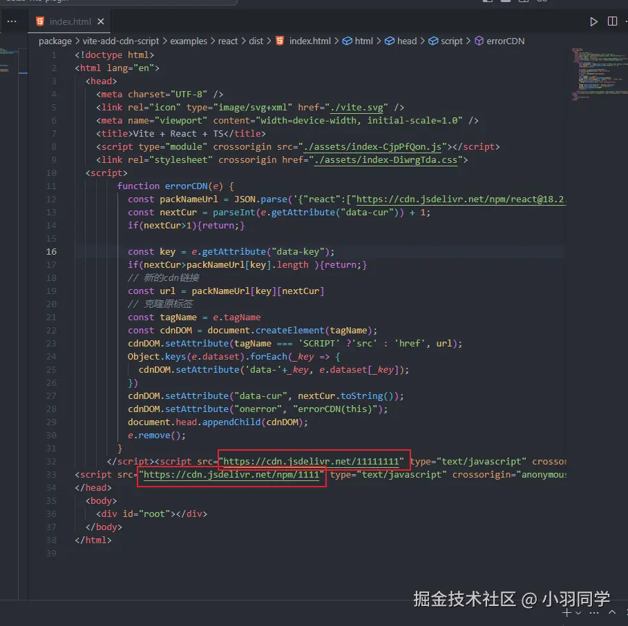 然后执行打包(pnpm run build),就会发现咱们得打包产物中,已经自动添加了cdn。对的,你已经掌握了cdn插件的使用,是不是非常简单呢?