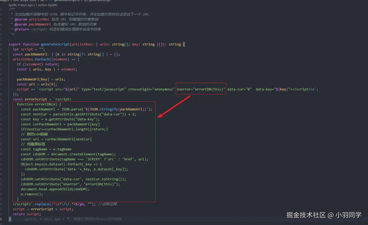 我们定义了一个errorCDN的方法,当cdn加载异常的时候,就会触发onerror。而我们在cdn对应的script中绑定这个errorCDN的方法,就会自动去新建一个新的script,并且去加载新的cdn。