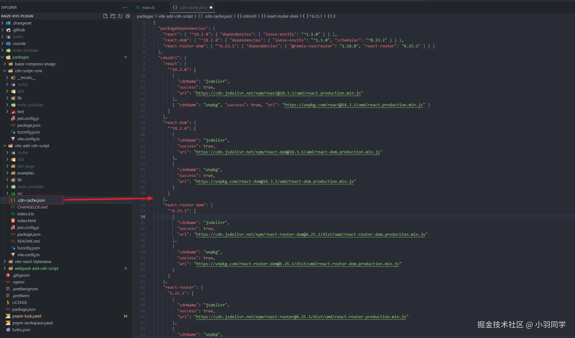 具体效果如下,打包时会自动在项目的根目录下新建了一个.cdn-cache.json。然后在后续的打包中,咱们的插件会先通过这个缓存文件来寻找cdn,如果没有再去通过cdn的接口来获取,这样子就可以有限的降低打包的cdn 接口请求耗时。