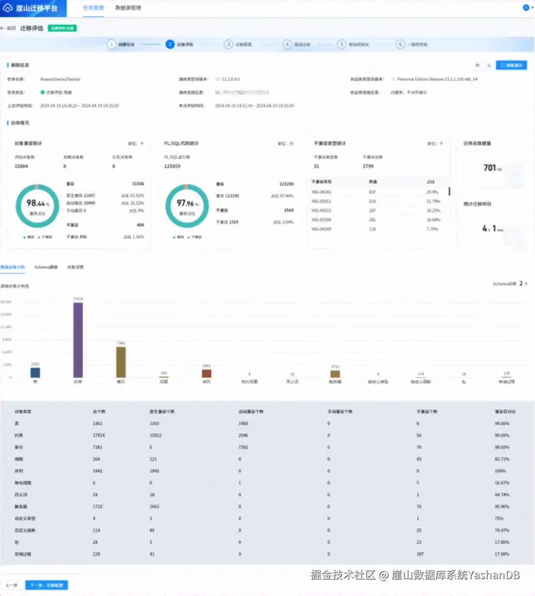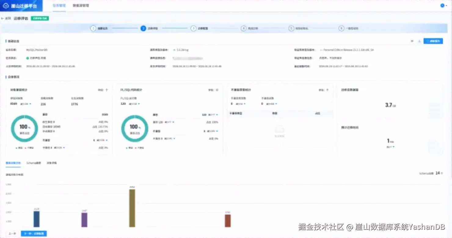 根据上面提示设置后,点击【下一步:开始迁移评估】,进入迁移评估阶段,如下所示,会对MySQL迁移到yashanDB的对象进行兼容性评估,如下所示。