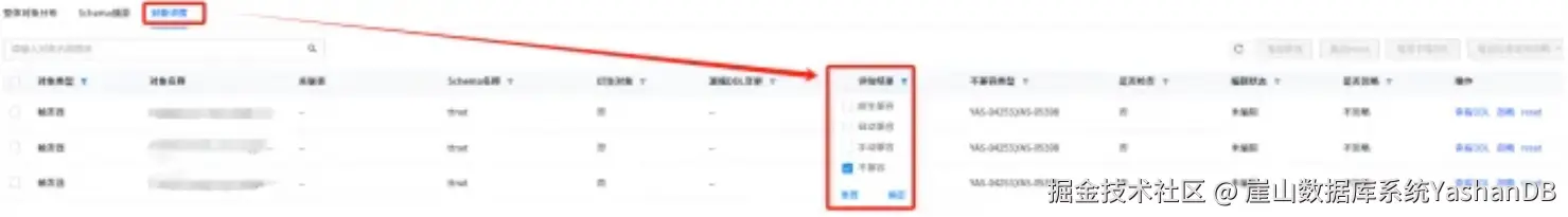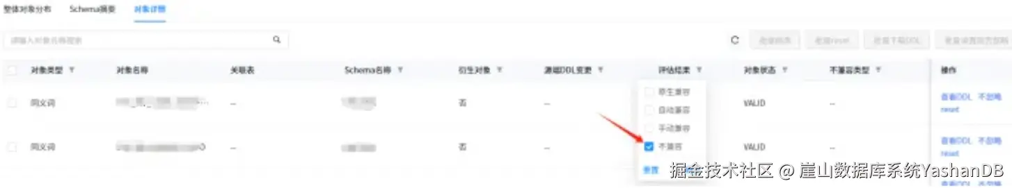 根据上面的评估结果,可以查看哪些对象不兼容,选择“不兼容”在【对象详情】菜单,选择【评估结果】项,勾选“不兼容”选项,如下所示: