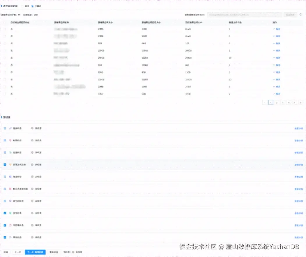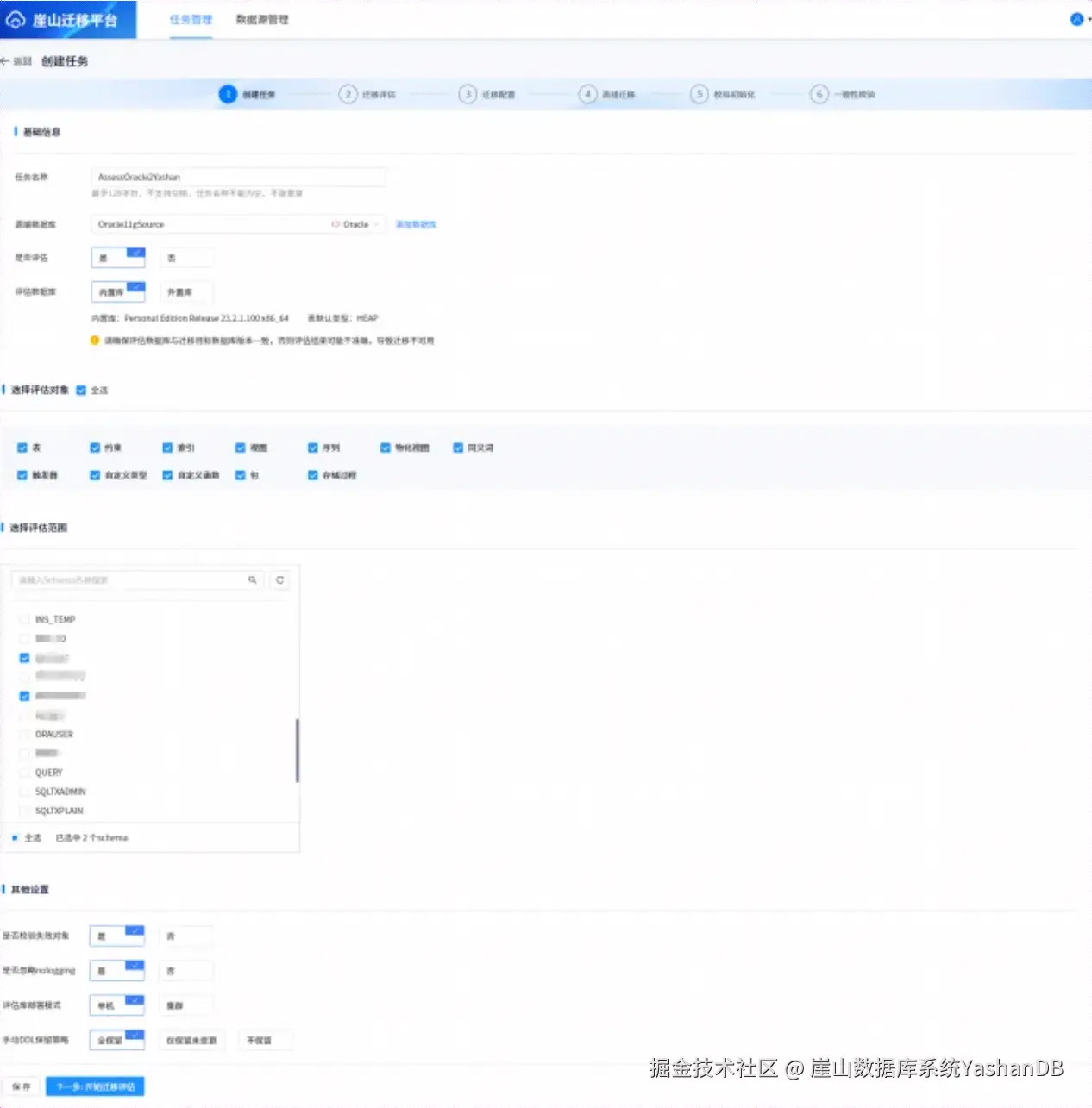 如上所示,在【目标端数据库及迁移范围】选择yashanDB外智库,在【迁移初始化配置】处,如果是首次迁移,可以选择默认,如果外置库已有之前迁移的对象而未删除,再次迁移可以选择【覆盖】,【表空间初始化】选择默认“跳过”。