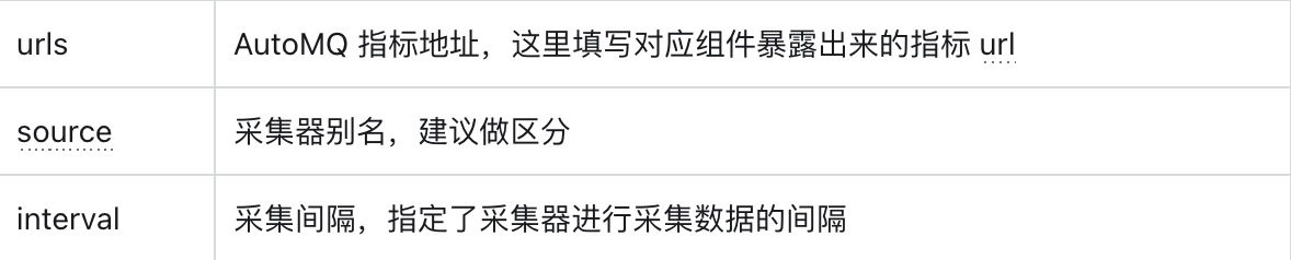 这里我们要在每个待采集数据的节点所在的服务器上配置好 DataKit 的 AutoMQ 采集器配置。进入目录/usr/local/datakit/conf.d/prom,创建一个采集器配置文件 prom.conf。采集器配置会包括开放的可观测数据接口、采集器名称、prom 实例名以及重要的采集间隔 interval 等,你可以根据需要对每个服务器上的配置进行一些调整: