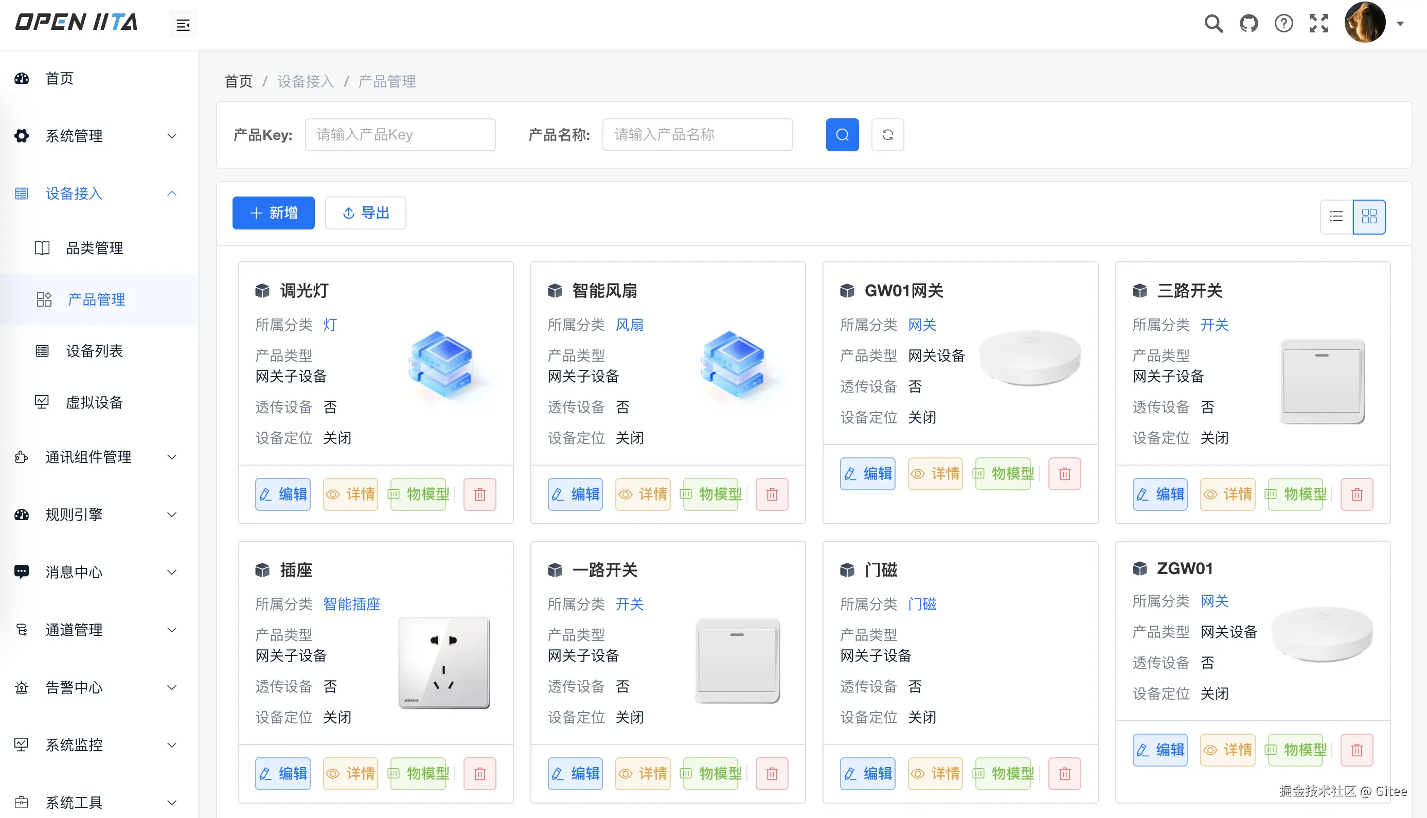 系统包含了品类、物模型、消息转换、插件管理(mqtt插件、EMQX插件、http插件、tcp插件、modbus插件等)、设备管理、设备分组、规则引擎、第三方平台接入、数据流转(http/mqtt/kafka)、数据可视化、告警中心等模块。