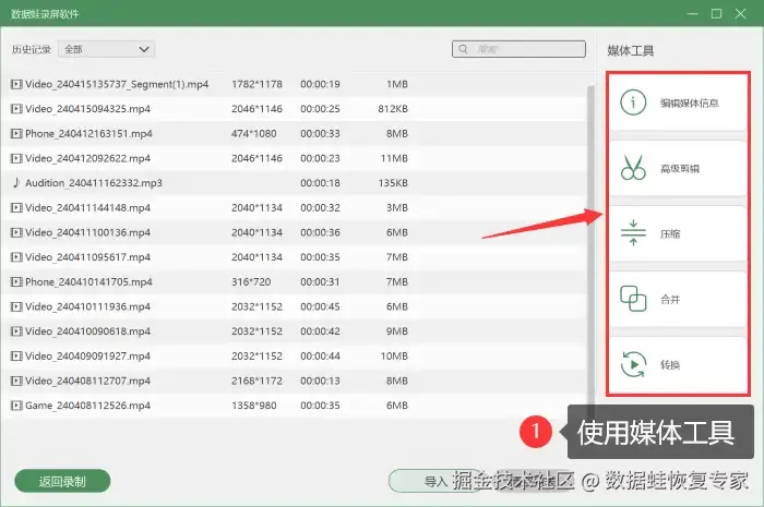 该软件拥有多种录制模式,包括视频录制、音频录制、游戏录制、窗口录制等,能够满足您日常中的大部分录屏需求。同时,它还能为您录制完成的视频进行剪辑、压缩、格式转换等操作。以下就是使用数 据 蛙录屏软件进行录屏的方法: