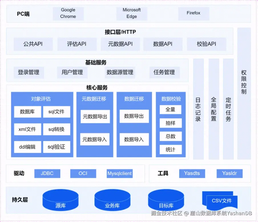 崖山迁移平台(YashanDB Migration Platform,下文以YMP代称)是YashanDB提供的数据库迁移产品,支持异构RDBMS与YashanDB之间进行迁移评估、离线迁移、数据校验的能力。YMP提供可视化服务,用户只需通过简单的界面操作,即可完成从评估到迁移整个流程的执行与监控,实现低门槛、低成本、高效率的异构数据库迁移。