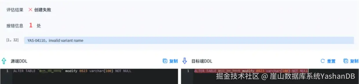 问题现象: YMP元数据迁移过程中出现纯数字的字段名无法设置非空约束报错。
