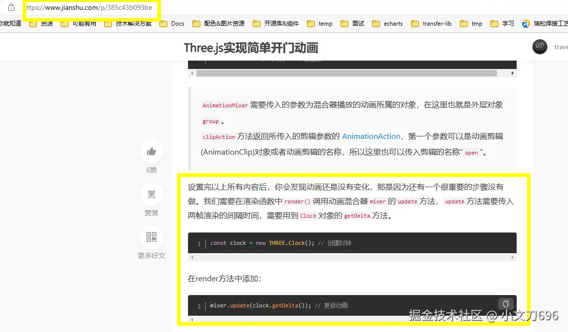 | 12345678910111213141516171819202122232425262728 | async function keyframeAni(``object``) {`` ``const times = [0, 2]; ``//关键帧时间数组,单位'秒'`` ``const rorateValues = [0, -Math.PI * 2]; ``//需要转动的角度`` ``const duration = 2 ``// 动画持续时间 ``// 关键帧轨道!!!`` ``const rotateTrack = ``new THREE.KeyframeTrack(`` ``'AnimationRef.rotation[y]'``, ``// animationRef-作用于模型的name.roration[y]-动画方式-绕y轴旋转`` ``times, ``//`` ``rorateValues`` ``); ``//动画剪辑`` ``const clip = ``new THREE.AnimationClip(``'modelRotation'``, duration, [rotateTrack]); ``//播放编辑好的关键帧动画`` ``// console.log(object); ``// const gp = new THREE.Object3D(); // 用一个3d物体包裹模型,旋转3d物体已达到绕自身旋转的效果。failed`` ``// gp.position.set(0, 0, 0);`` ``// gp.add(object); ``mixer = ``new THREE.AnimationMixer(``object``);`` ``const animation = mixer.clipAction(clip);`` ``animation.setLoop(THREE.LoopOnce, 1) ``// 设置帧动画只播放一次!!! //默认是无线循环,infinity!!!`` ``animation.timeScale = 1 ``//调节播放速度,默认1,0动画暂停,负数动画反方向执行。`` ``animation.play() ``//开始播放。``} |