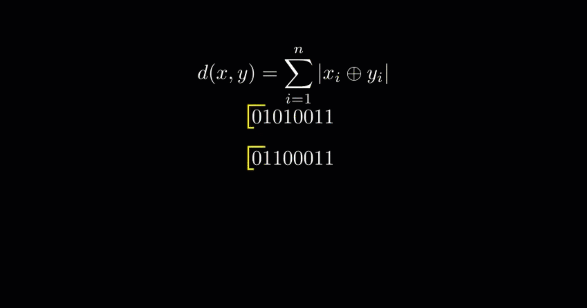 汉明距离相当简单,对于每个单独的位,我们计算与另一个向量中相应位的异或。然后我们将结果位相加。