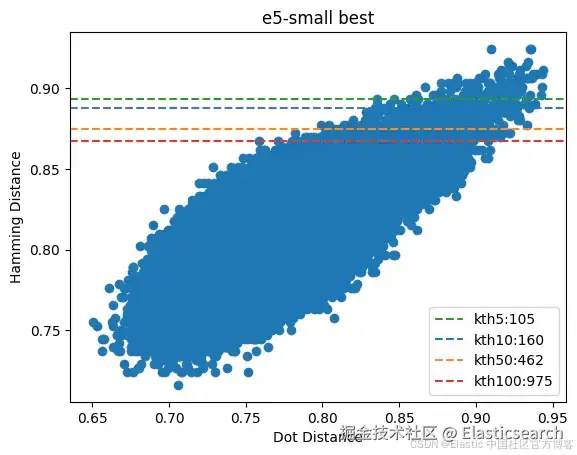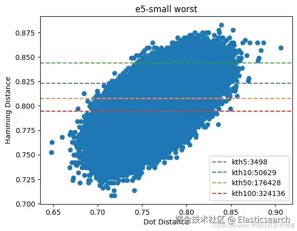 图 6:表现最差的 e5-small 查询向量及其距离。汉明距离和点积距离实际上不相关。
