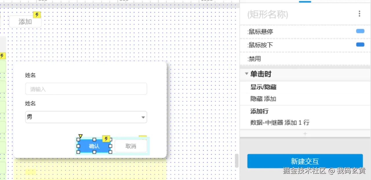 之后再给添加页面的【确认】按钮添加【单击】事件,当点击确认按钮时隐藏这个添加页面,并向中继器中添加一行数据
