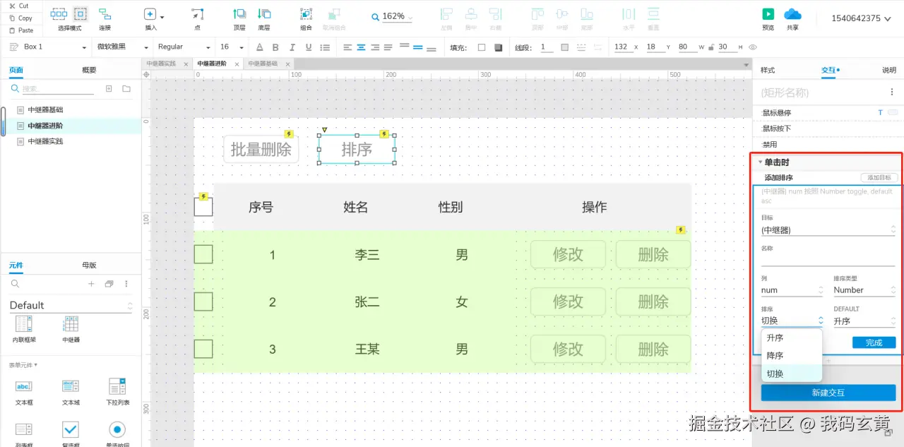 axure提供了一个极为便捷的排序机制,允许我们直接进行数据的排序操作,我们添加一个【排序】的按钮,给它添加【单击事件】 【添加排序】,这里允许我们在【排序类型】选择不同的方式排序。