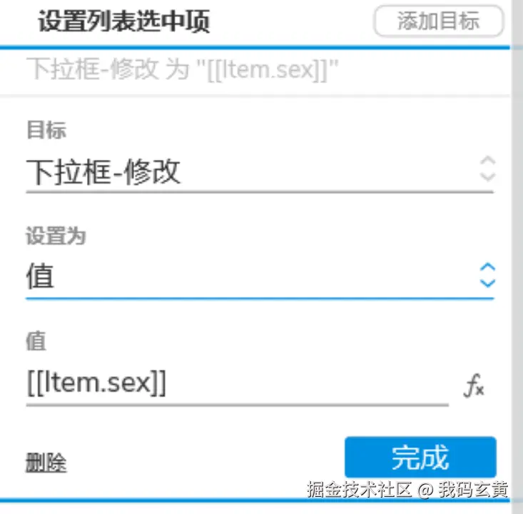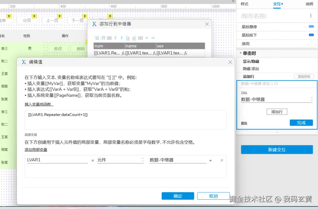 最后一个就是下拉框的性别来作为我们中继器的【sex】这个字段的数据,同上原理,将下拉框作为局部变量,获取下拉框选中的文字就行了
