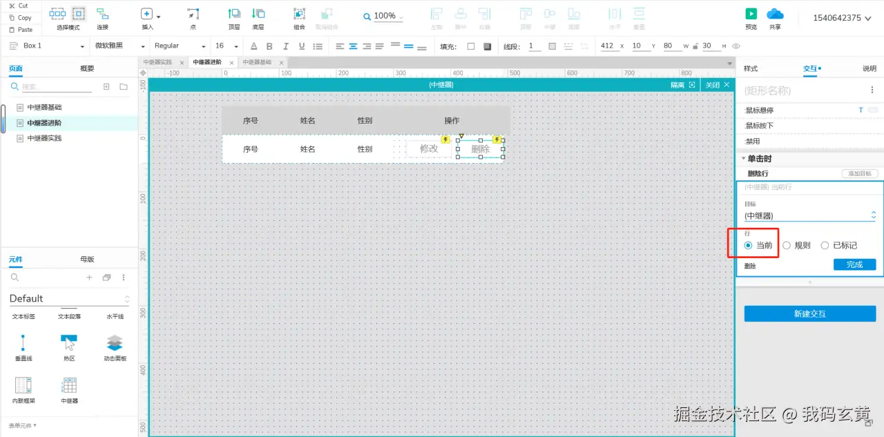 选择【当前】行修改后 axure 会自动帮我们匹配到这个事件对应的元件的所在行,并修改对应行的数据。