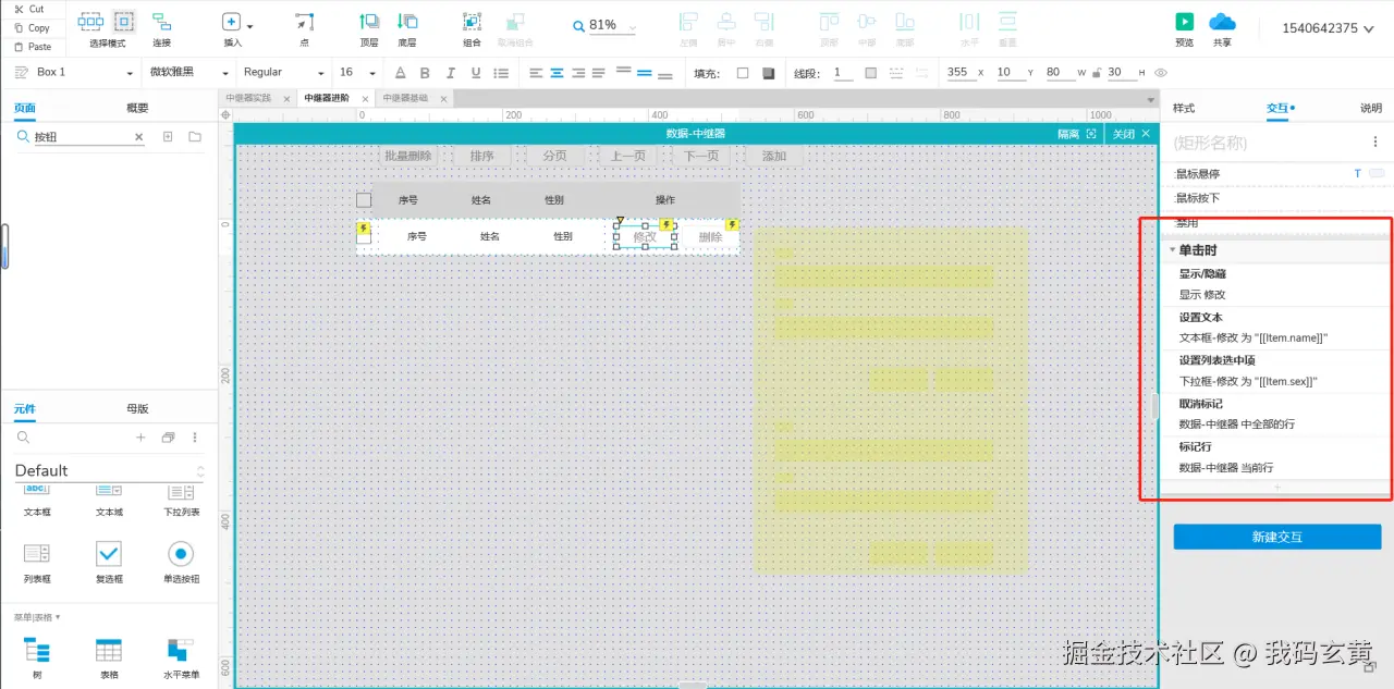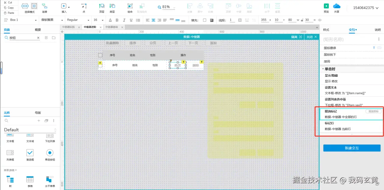 还要注意的是为了避免改一行数据时修改多行数据,所以需要【取消标记】 【中继器的所有行】,再【标记行】标记中继器的当前行。