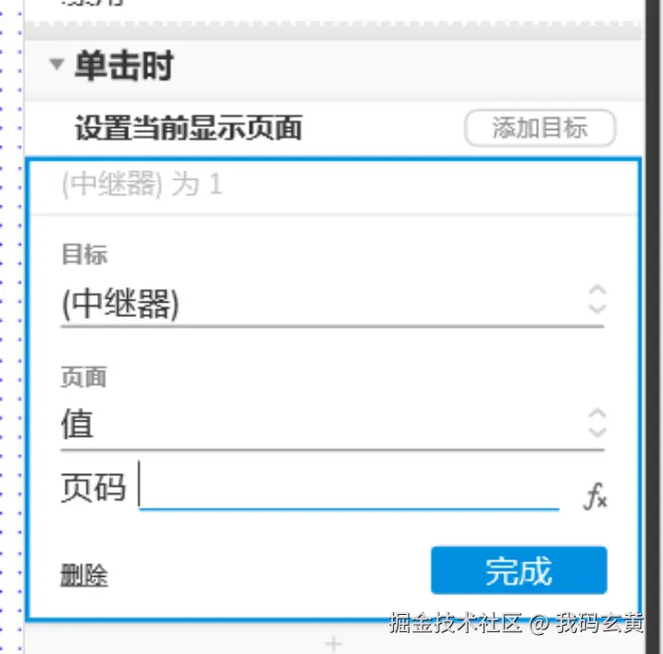 这里可以看到我们在中继器内部添加的事件,在编辑的时候【行】的版块多了一个【当前】的选项。